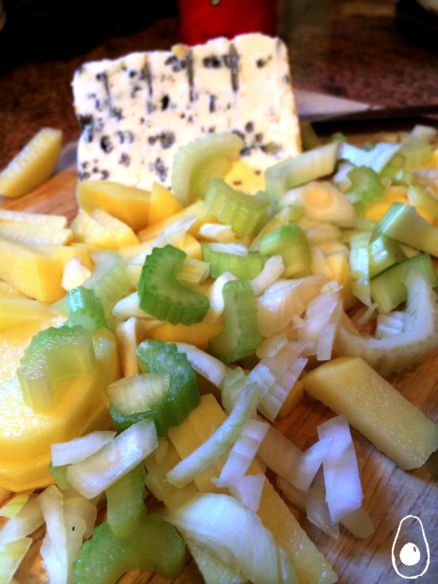 Fortunately, CB was on hand with this soup. At first, as she delivered this news (very softly and in even tones, so my head wouldn’t split open), I baulked at the idea of a creamy, cheesy soup. Turns out she was bang on the money. This soup is rich and flavoursome and works great for a winter treat during the holiday season. The celery cooks down and adds a great base flavour without leaving any trace of its original flavour (which is exactly how we like it). Use any blue cheese you’re fond of; our favourite is a very strong stilton that’s got more blue than cheese.