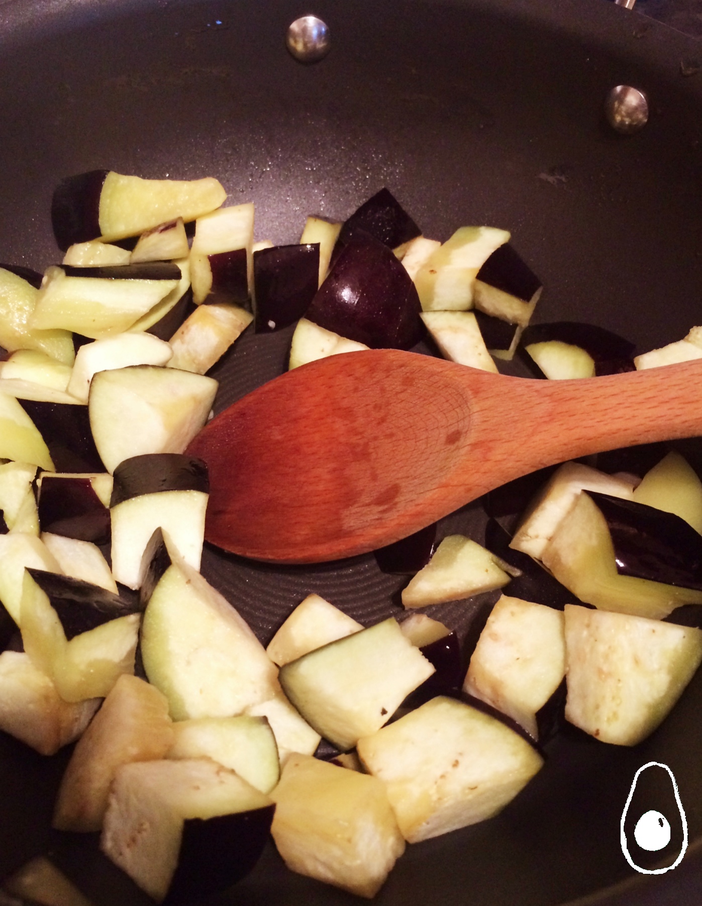 - Heat the oil in a heavy-bottomed saucepan that has a lid until oil is shimmery but not quite smoking and fry the cubed aubergine in there for a few minutes until browned all over.