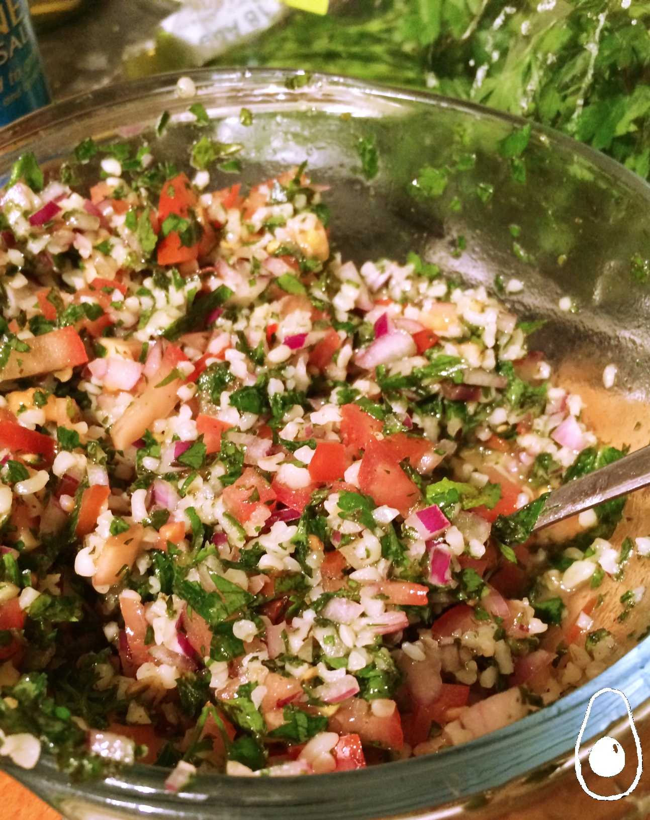 - Use these 15 minutes to prepare the rest of your tabbouleh ingredients, adding/mixing everything in a bowl (including the cooked bulgur) and finally adjusting the olive oil, salt and lemon juice to taste.